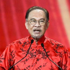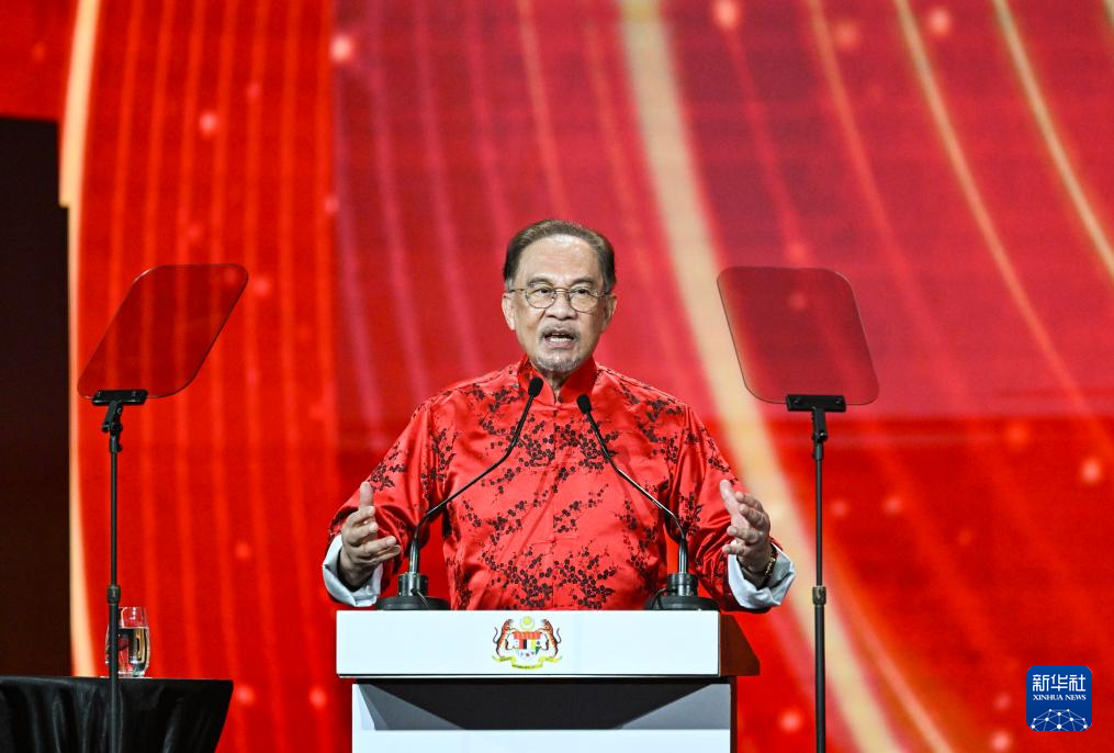 1月25日晚,马来西亚总理安瓦尔在吉隆坡出席2025年“欢乐春节”全球启动仪式暨“欢乐春节 五洲同欢”演出时致辞。