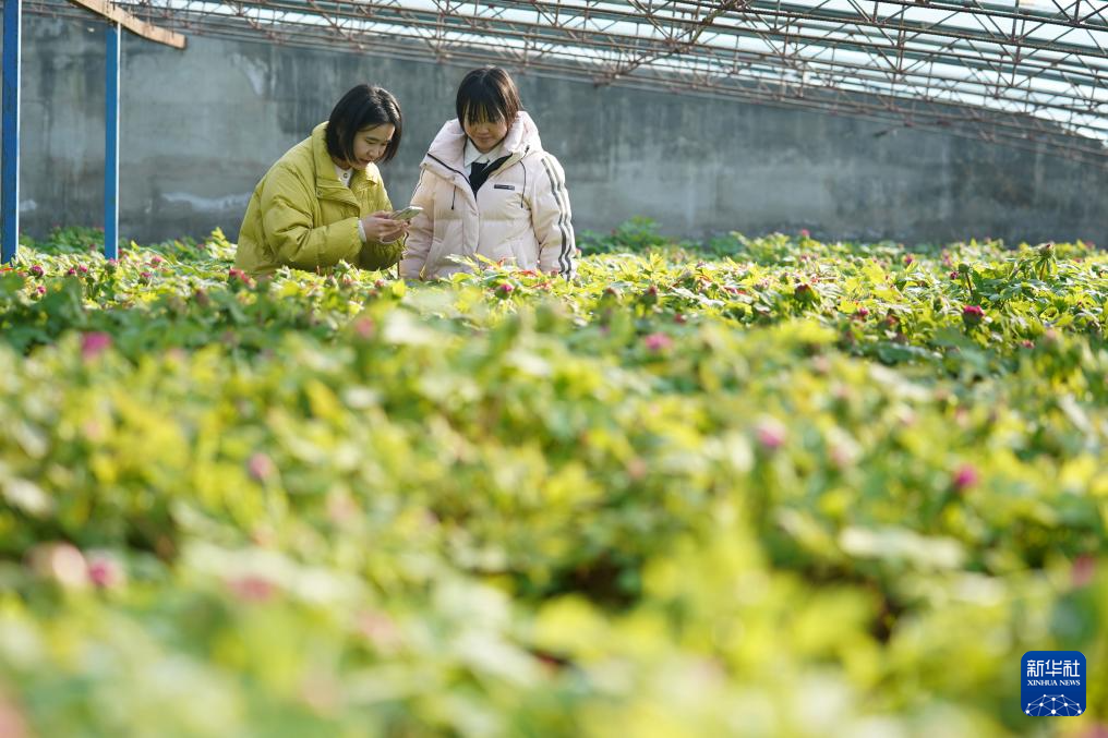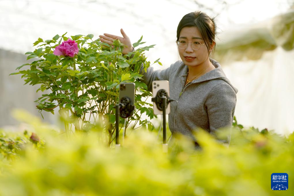 1月26日,河北省柏乡县汉牡丹园工作人员在直播平台推介牡丹。