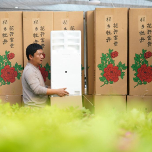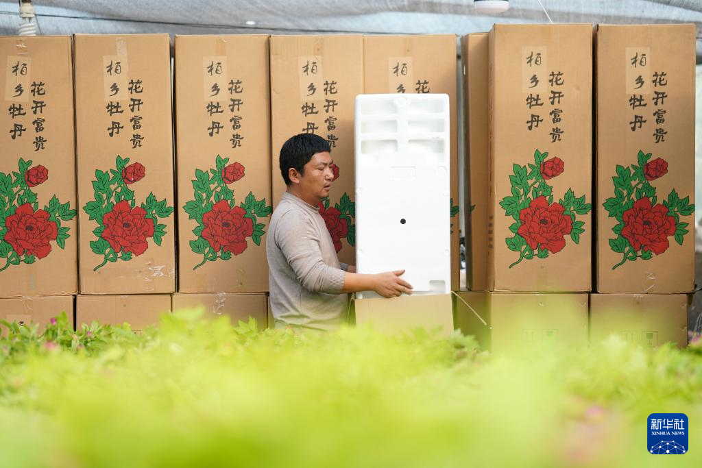 1月26日,河北省柏乡县赵庄村花农在一处花卉大棚内将牡丹装箱,准备销售。