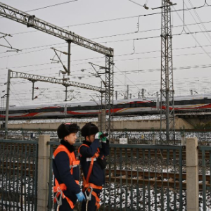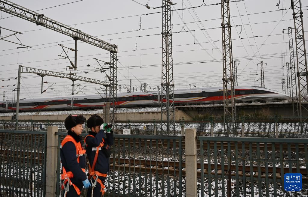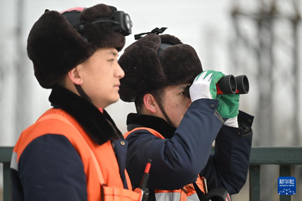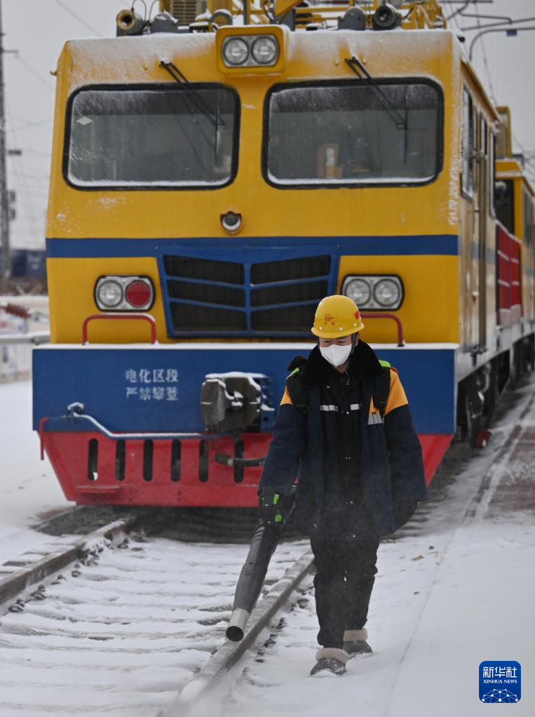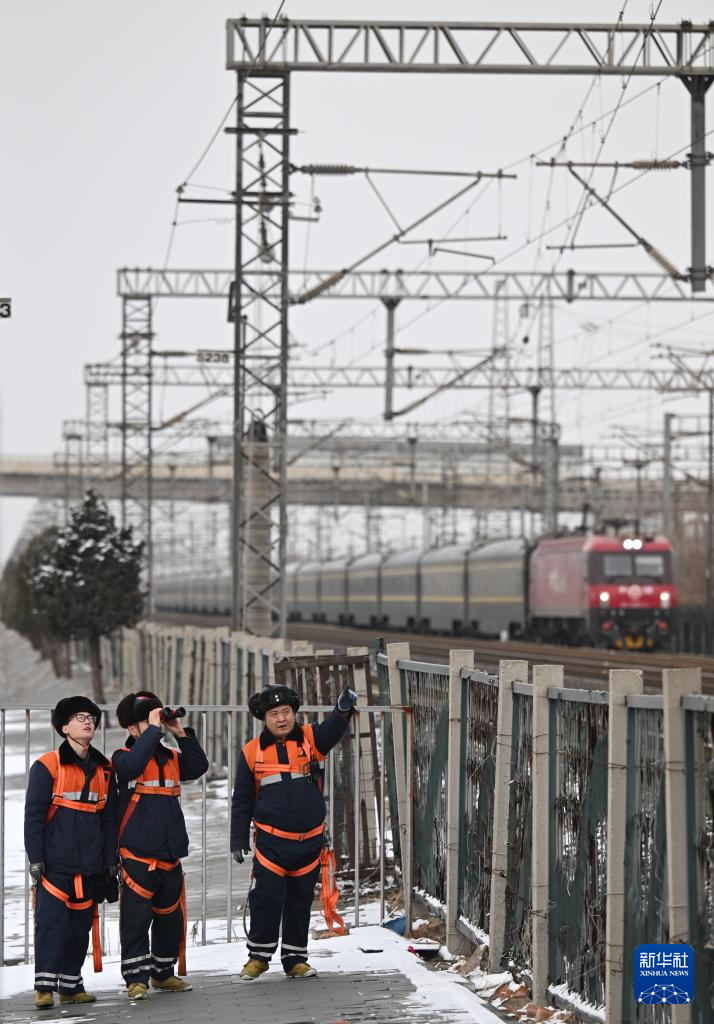 寒潮来袭,中国铁路北京局集团有限公司天津供电段供电维修车间组织应急抢险人员上岗待命,在雪后对铁道上方的接触网运行状态进行巡视,确保春运期间供电设备安全运行。