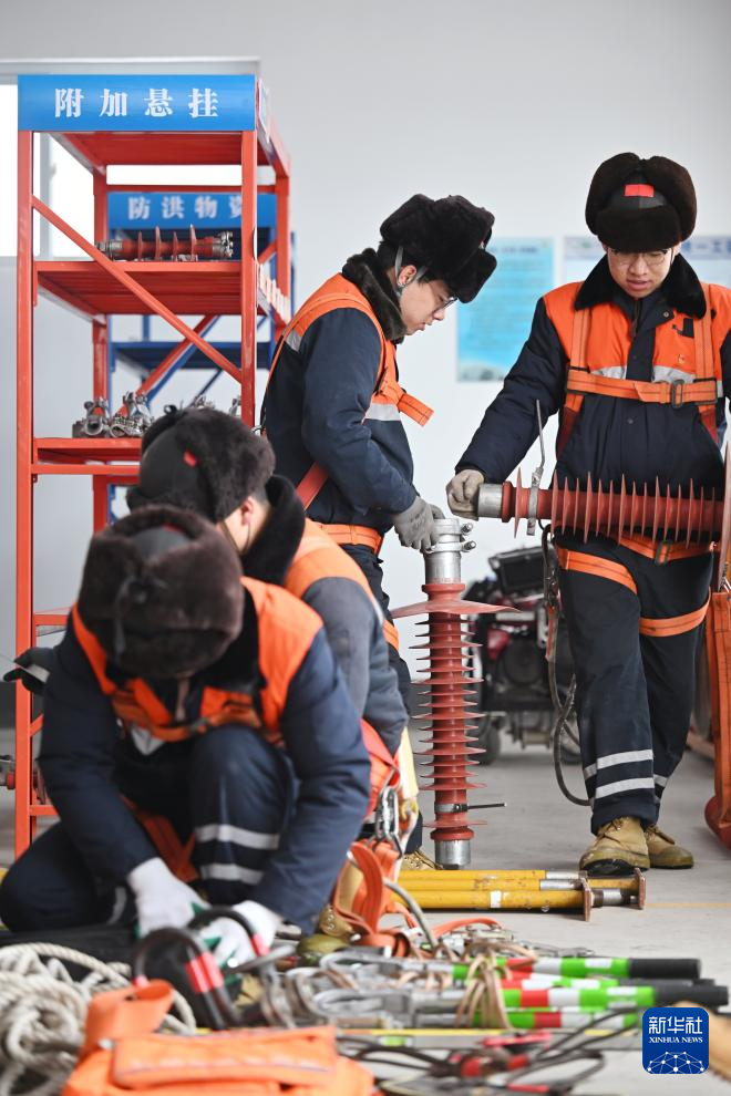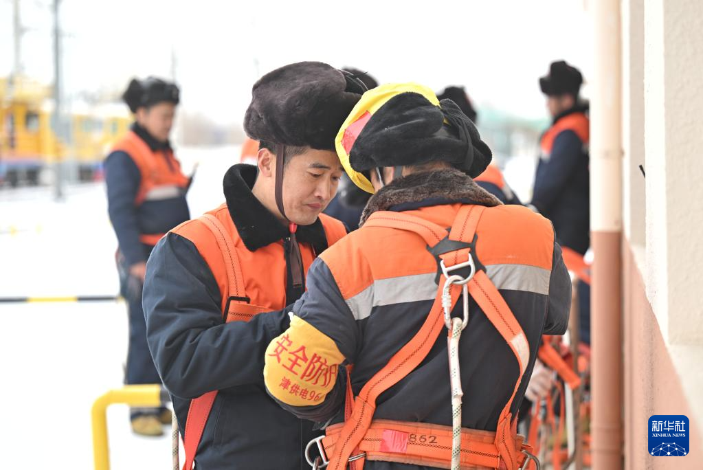 1月26日,在天津供电段接触网综合维修列基地,铁路职工在穿戴劳保用品。