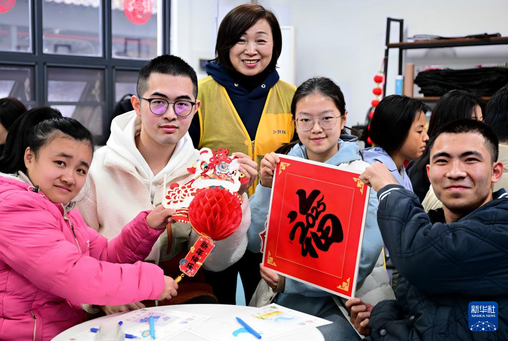 1月26日,在福州市第二社会福利院,志愿者章宇轩(左二)与福利院的年轻人展示制作的新春灯笼和“福”字。