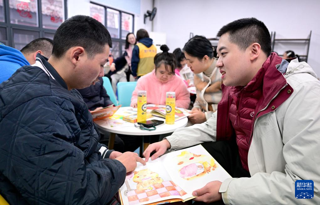 1月26日,在福州市第二社会福利院,青年志愿者黄铭淦(右一)与福利院的年轻人一起阅读绘本。