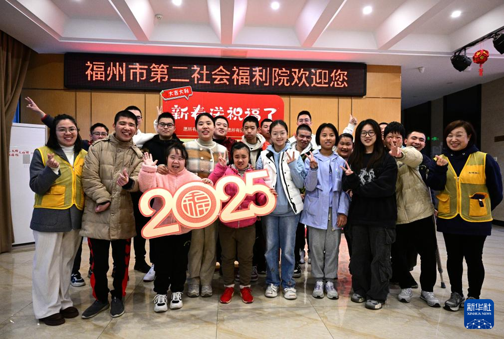 1月26日,在福州市第二社会福利院,青年志愿者与福利院的年轻人一起合影留念。