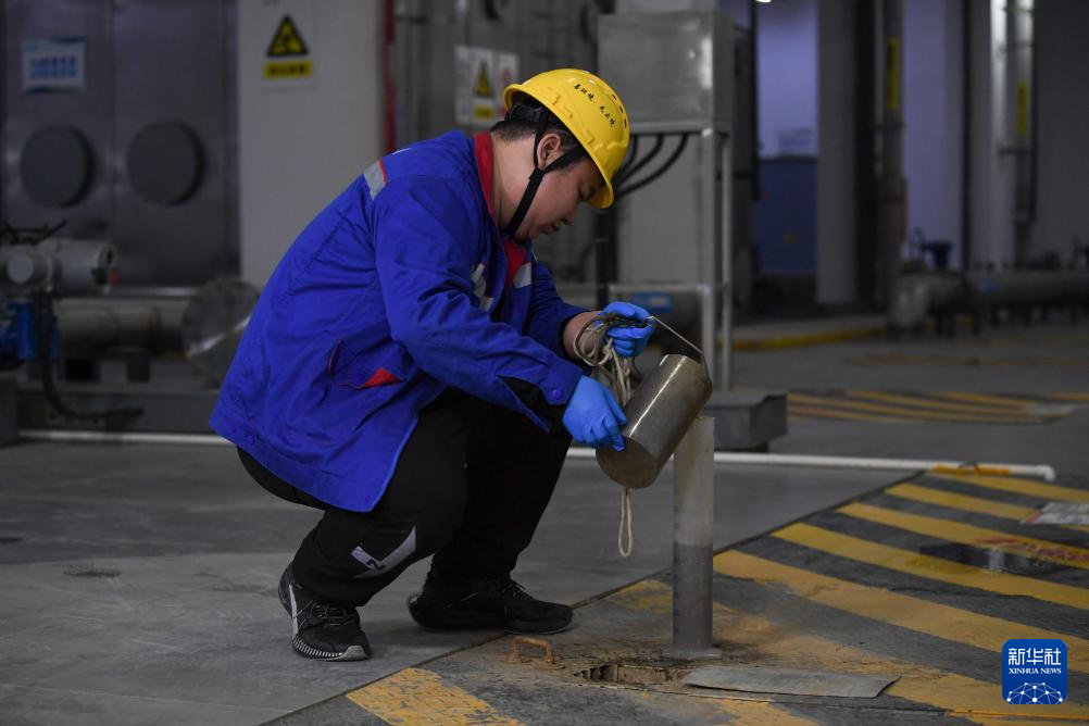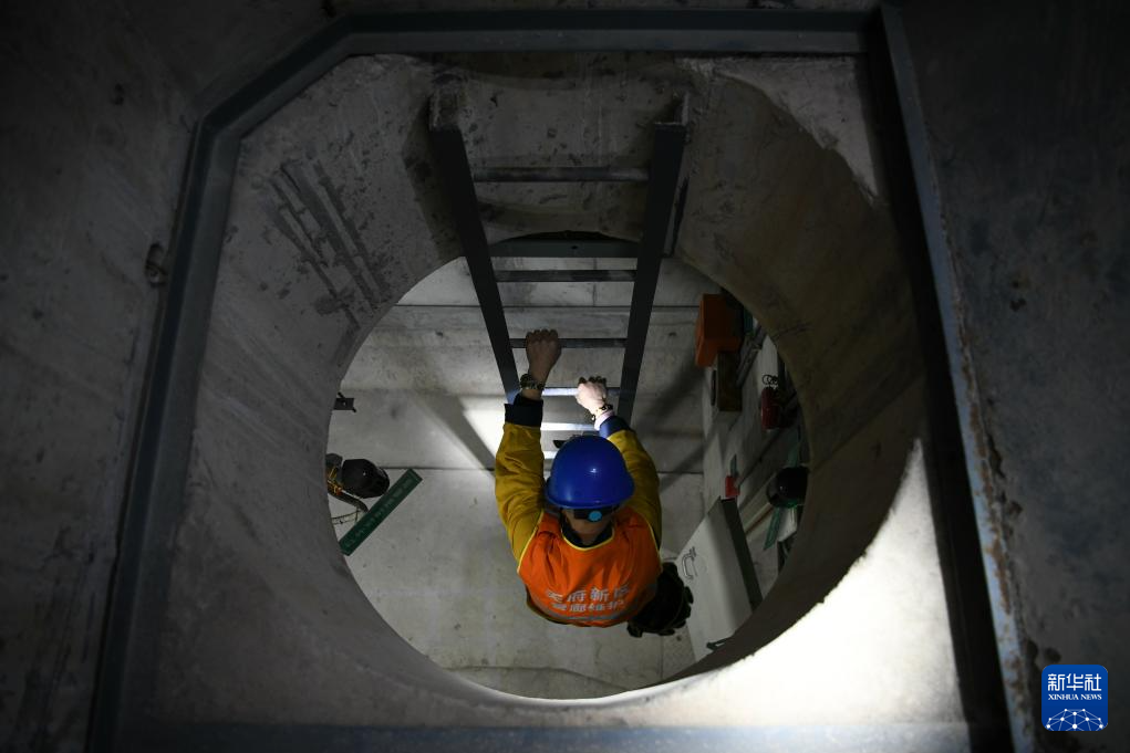 1月26日,在四川天府新区雅州路综合管廊,管廊维护员从设备层下到“能源舱”检查设备运行情况。