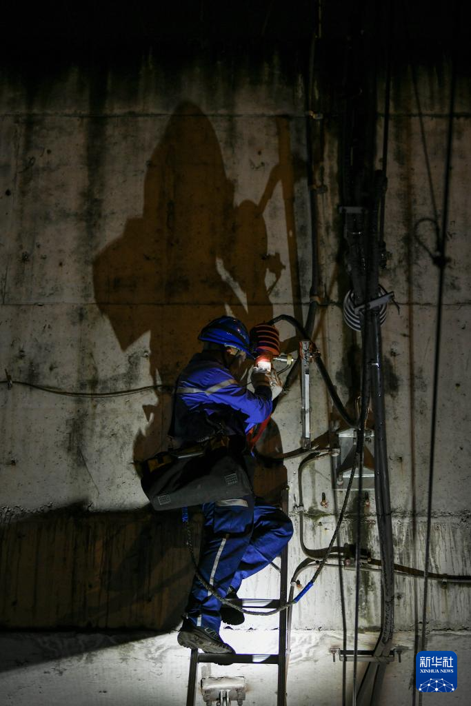 1月26日凌晨,成都地铁北郊接触网2班工作人员在地铁隧道外更换避雷器。
