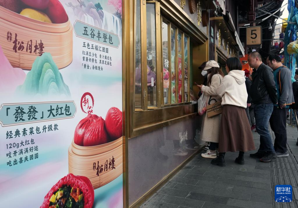 1月27日,游客在上海豫园“春风松月楼”窗口排队购买大红包、五谷丰登包等新春新品包子。