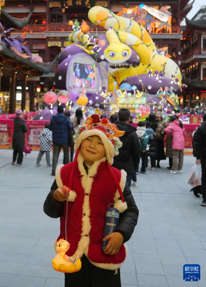 1月25日,小朋友在上海豫园灯会生肖蛇主题灯组前留影。