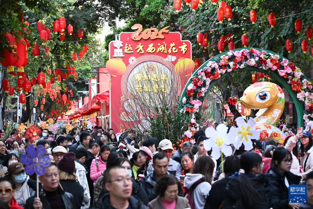1月27日,人们在广州越秀西湖花市选购、游玩。