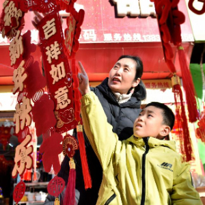 1月27日,在安徽省亳州市谯城区,市民在选购春节饰品。