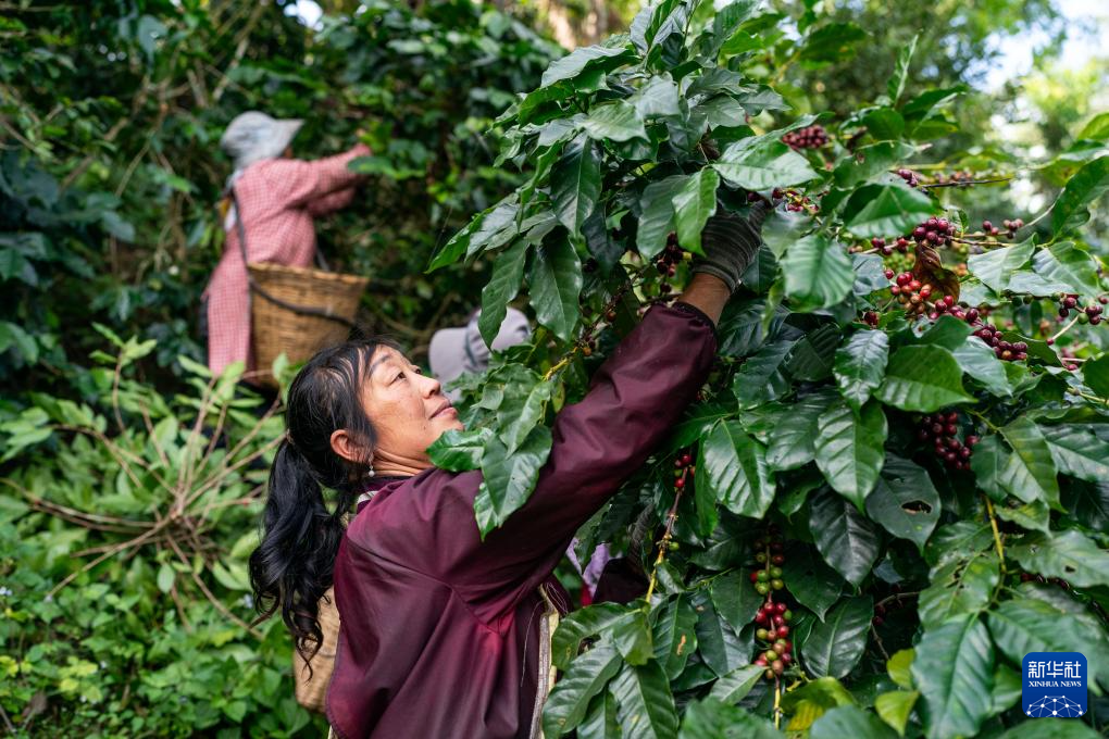 咖农在云南省普洱市思茅区天玉咖啡庄园采摘咖啡果(1月8日摄)。新华社记者 孙瑞博 摄pagebreak