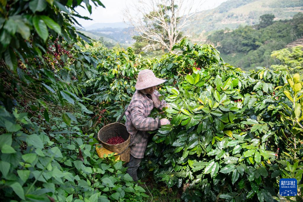 咖农在云南省普洱市思茅区天玉咖啡庄园采摘咖啡果(1月8日摄)。新华社记者 胡超 摄pagebreak