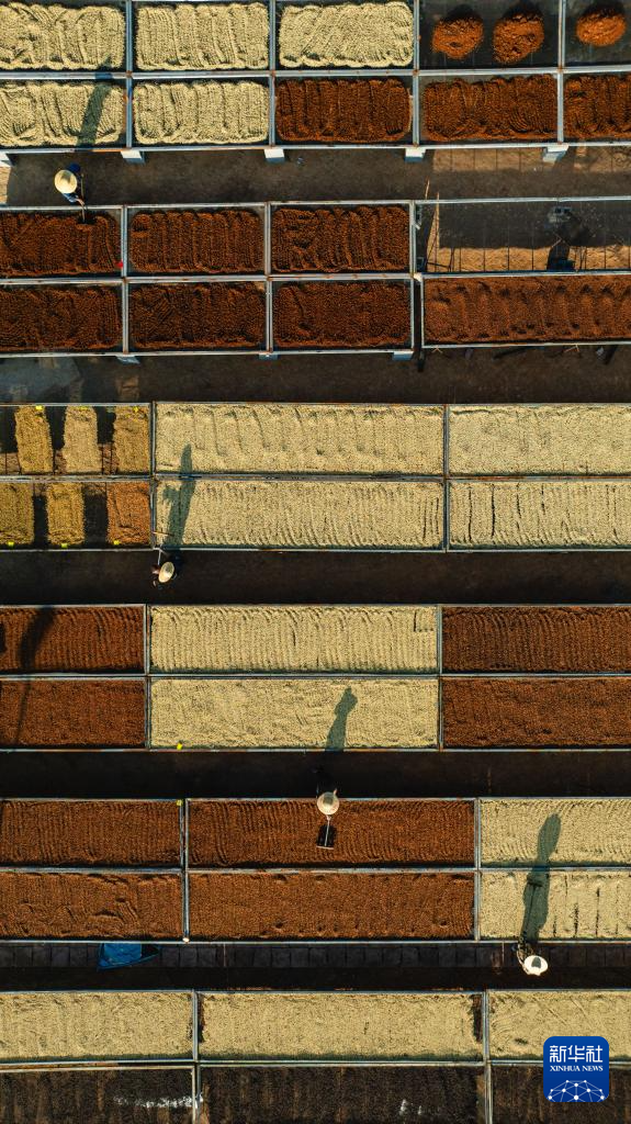 工作人员在云南省普洱市思茅区大开河梅子咖啡庄园的咖啡晒场翻晒咖啡(无人机照片,1月7日摄)。新华社记者 胡超 摄pagebreak