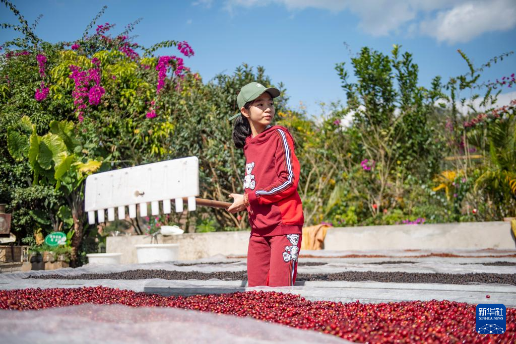 在云南省普洱市思茅区的天玉咖啡庄园,和家人一起旅行的青岛女孩刘子萌体验翻晒咖啡果(1月8日摄)。新华社记者 孙瑞博 摄pagebreak