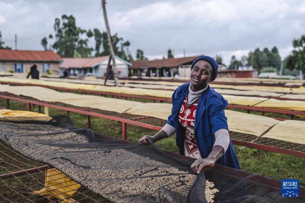 工人在肯尼亚基里尼亚加郡一家咖啡加工厂内晾晒咖啡豆(2024年12月18日摄)。新华社记者 王冠森 摄pagebreak