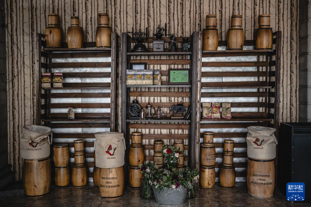 这是在埃塞俄比亚首都亚的斯亚贝巴一家咖啡店内拍摄的陈列架(1月8日摄)。新华社记者 王冠森 摄pagebreak