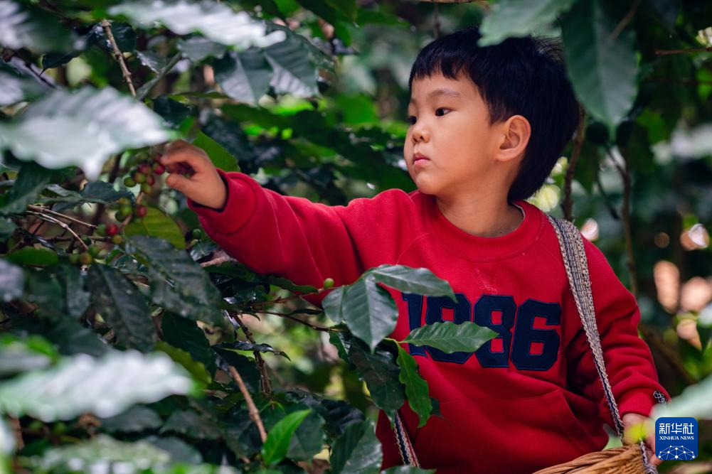在云南省普洱市思茅区野鸭塘河谷咖啡庄园,一名随父母来旅游的孩子体验采摘咖啡果(1月7日摄)。新华社记者 胡超 摄pagebreak