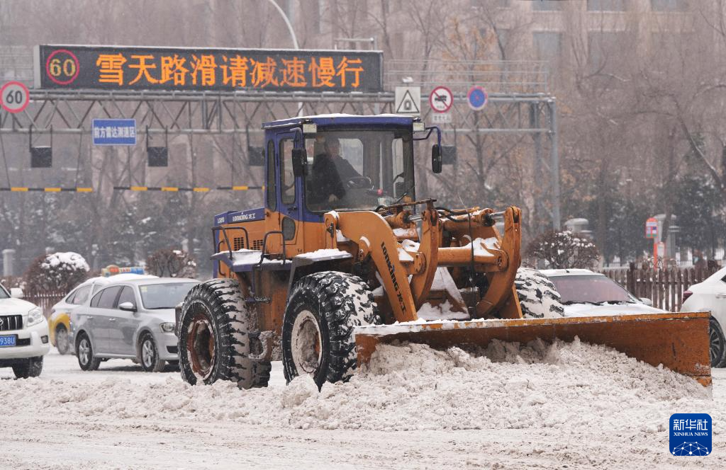 1月27日,大型机械在沈阳街头除雪。