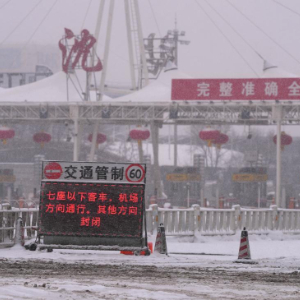 1月27日,受降雪影响,沈阳一高速公路入口进行交通管制。