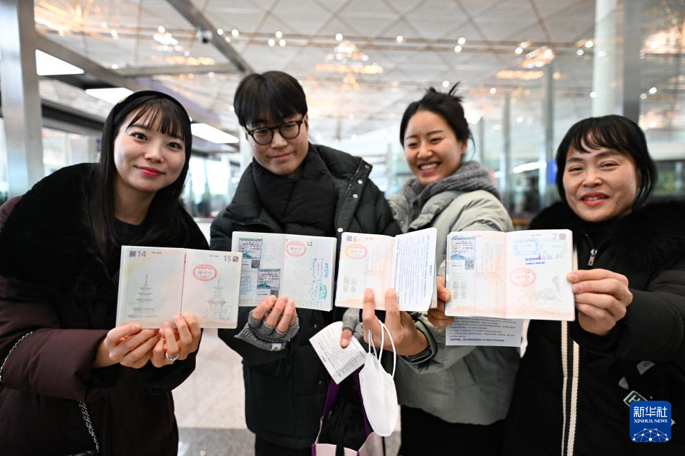 1月28日,在首都国际机场,四名韩国游客利用免签政策来中国旅游,他们向记者展示着护照上的入境章。