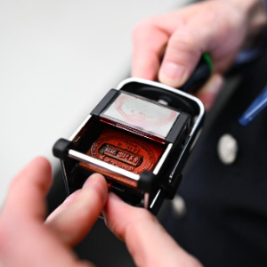 1月28日,首都国际机场三号航站楼的边检民警调整入境章上的日期。