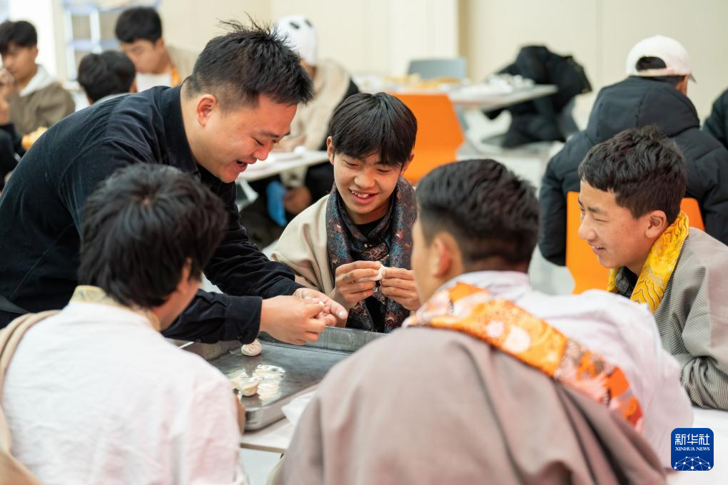 1月28日,在位于安徽省合肥市肥东县的合肥理工学校,西藏班的学生和老师们一起做团圆饭。