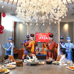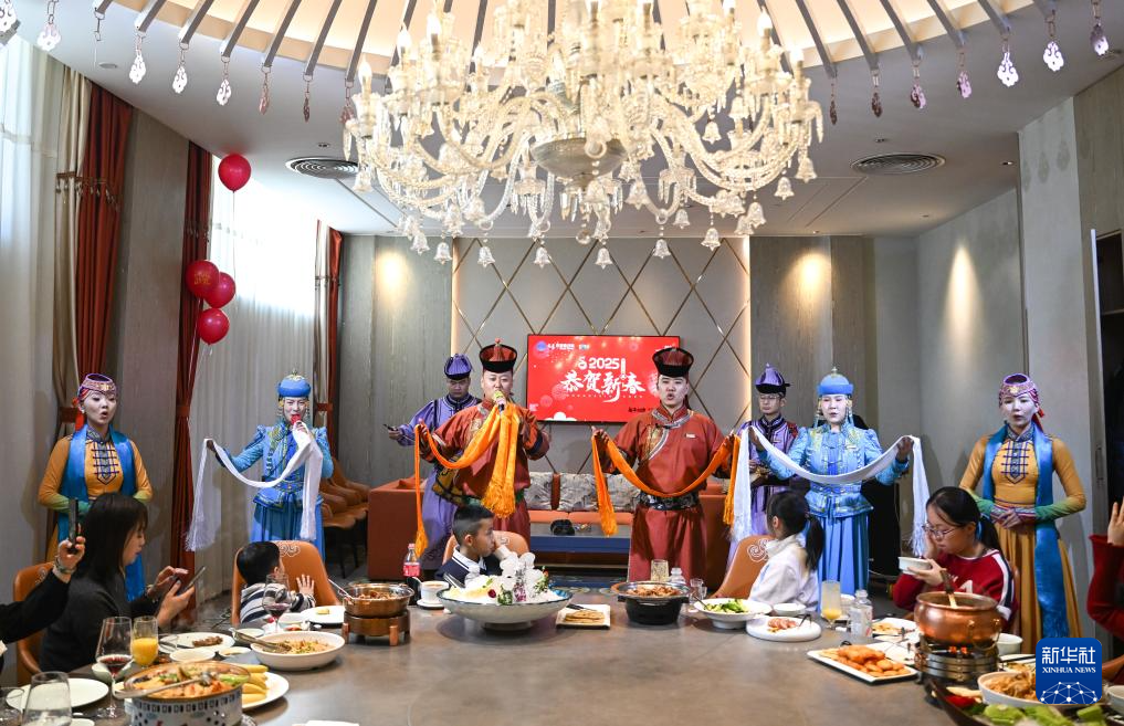 1月28日,在内蒙古呼和浩特市赛罕区一家饭店内,演员为吃团圆饭的顾客们演唱歌曲、敬献哈达,增添喜庆氛围。
