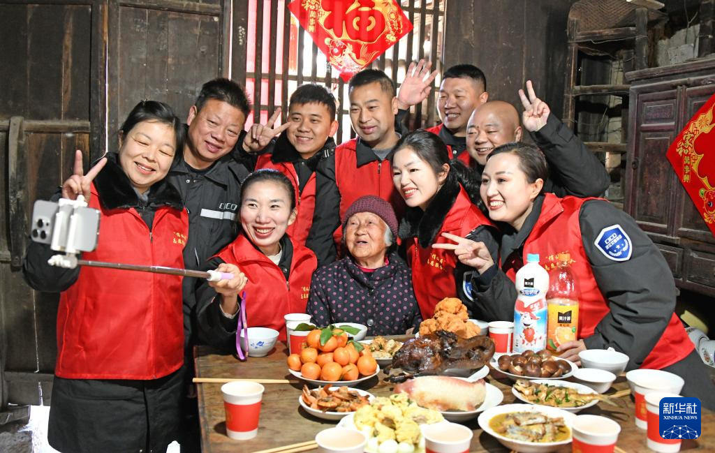 1月28日,志愿者在浙江省仙居县南峰街道下郭社区陪95岁独居老人吃“团圆饭”并合影。他们还帮老人搞卫生、挂灯笼、贴春联,让老人开心过大年。