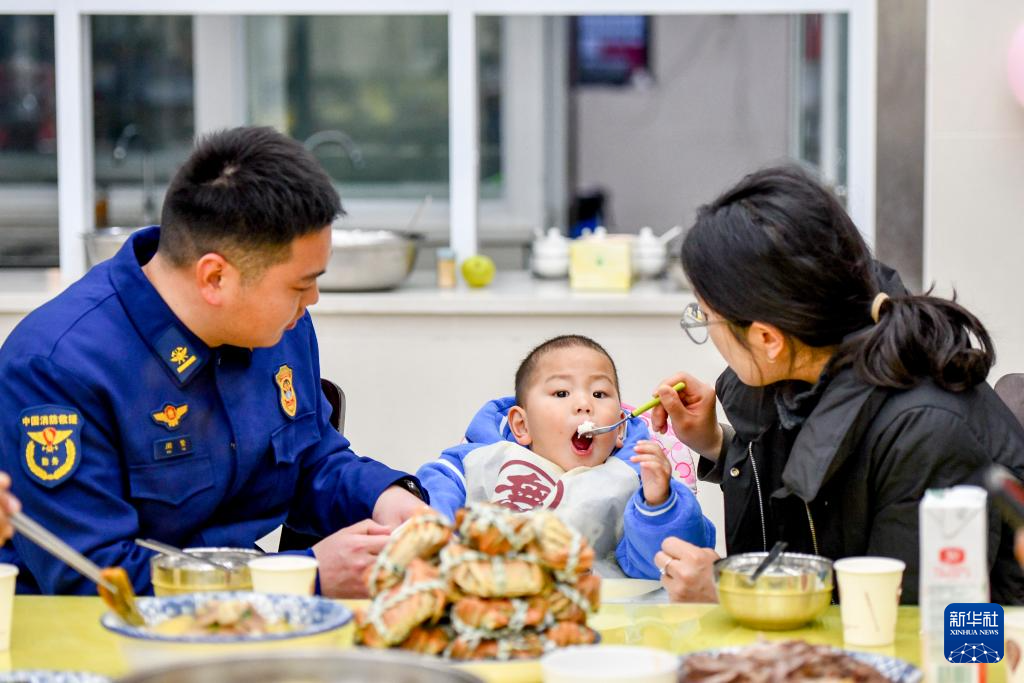 1月28日,在江苏省泰州市海陵区迎春西路消防救援站,消防员和家属一起吃团圆饭。