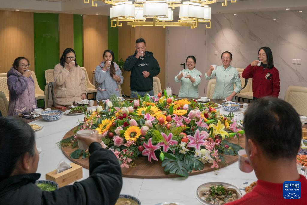 1月28日,在云南省红河州妇幼保健院月子中心食堂,工作人员与新生儿父母一起吃团圆饭。