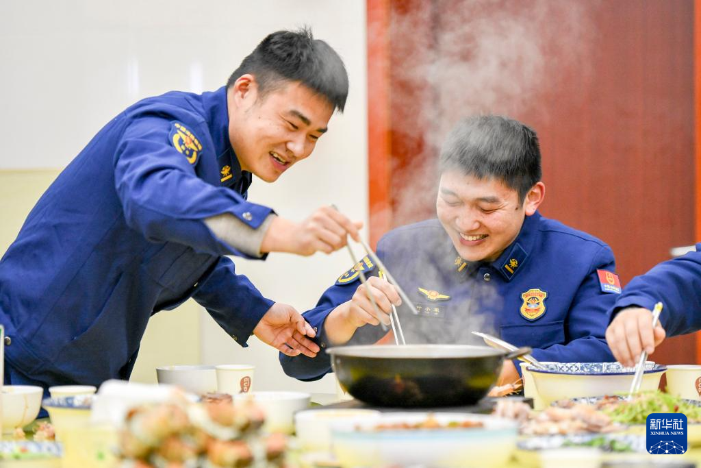 1月28日,在江苏省泰州市海陵区迎春西路消防救援站,消防员们一起吃团圆饭。