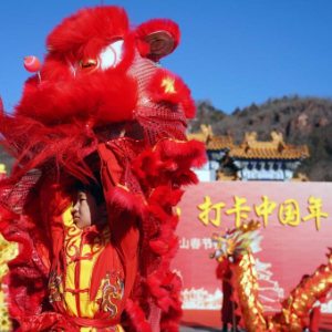 1月29日,在山东省临沂市兰山区新琅琊景区,民间艺人为游客表演舞狮。