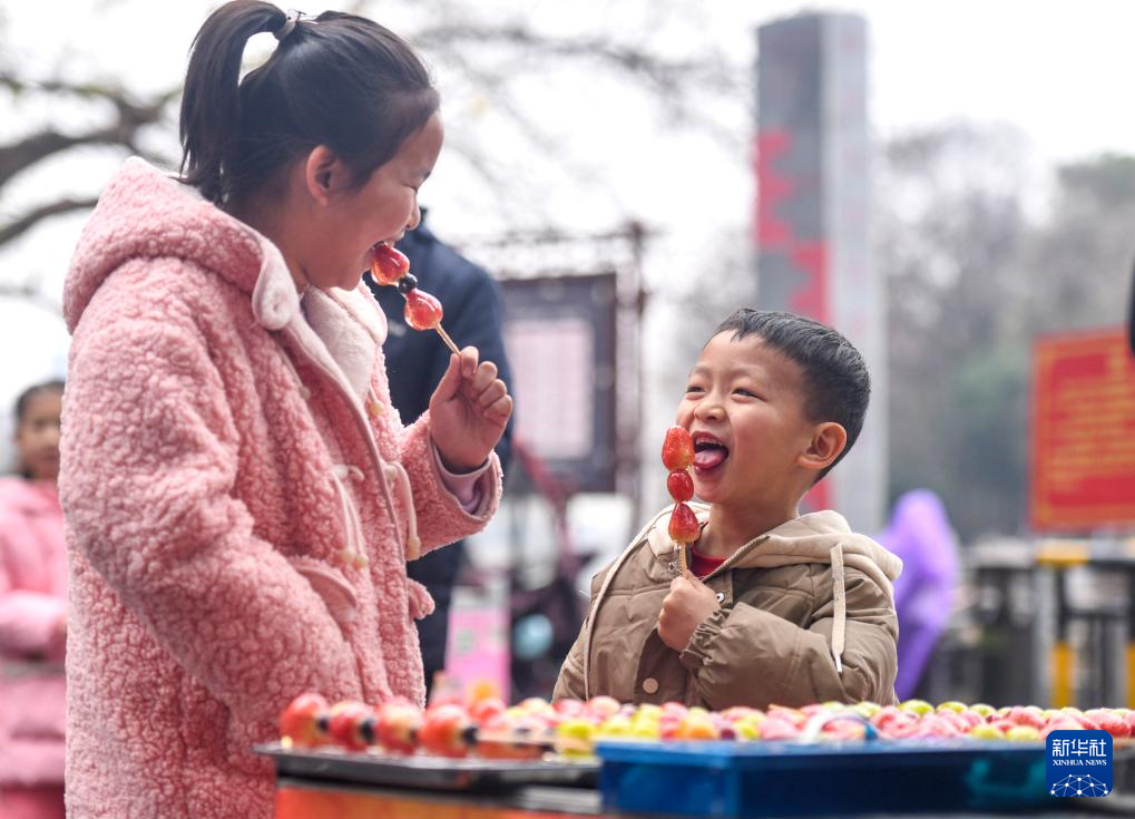 1月29日,在湖南省永州市道县潇水中路,小朋友品尝冰糖葫芦。
