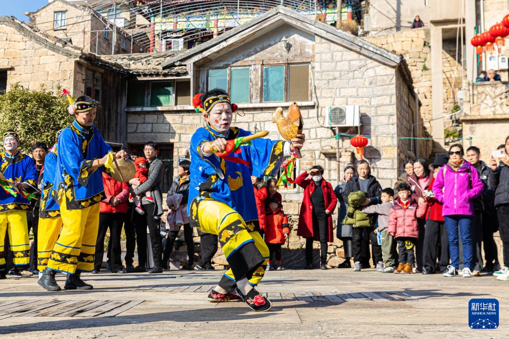 1月29日,身着传统服饰的演员在浙江省温岭市石塘镇里箬村表演大奏鼓。