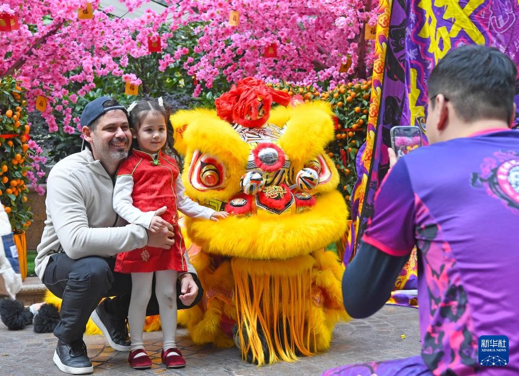 1月29日,在山东省青岛市市北区大鲍岛休闲街区,小朋友在新春年味大集上与舞狮表演者互动。