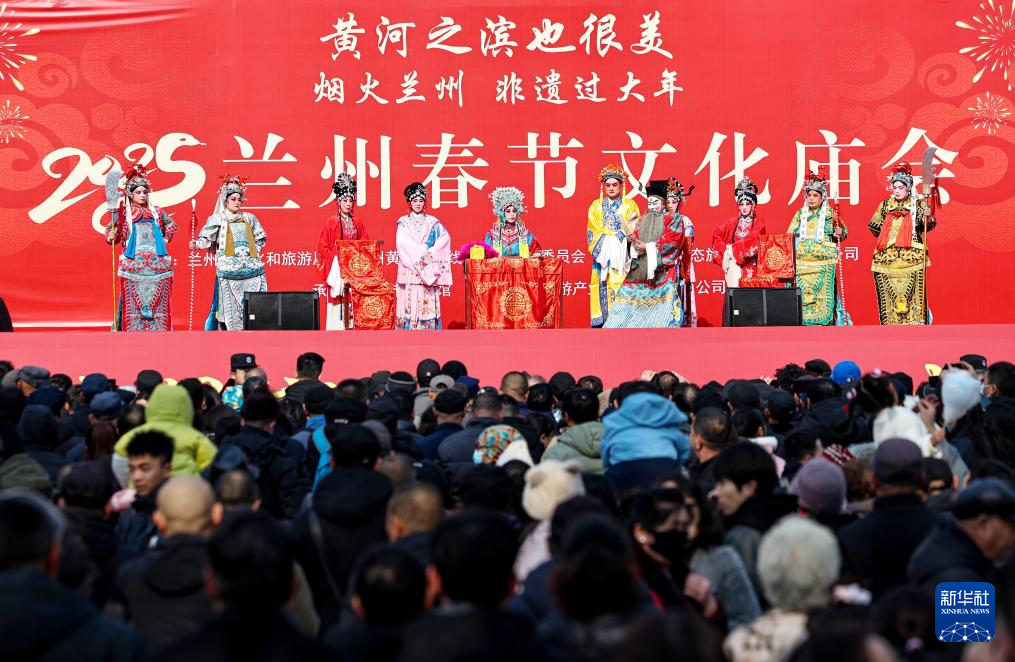 1月29日,人们在甘肃省兰州市金城关黄河文化旅游街区观看戏剧表演。