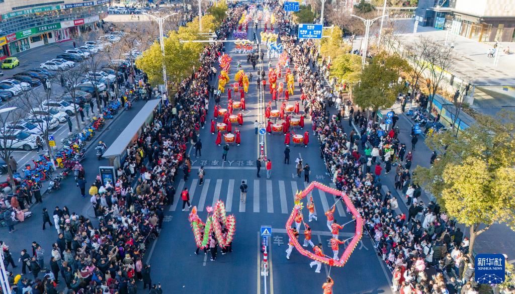 1月29日,演员在江苏省海安市“龙腾狮跃贺新春”巡游展演活动上进行民俗文化表演(无人机照片)。