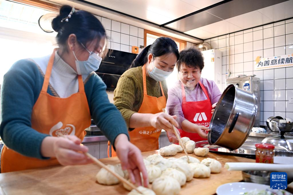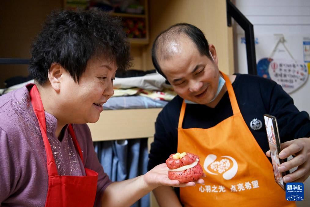 1月28日,常向阳(右一)在“心羽家园”和患儿家长一起做年夜饭。
