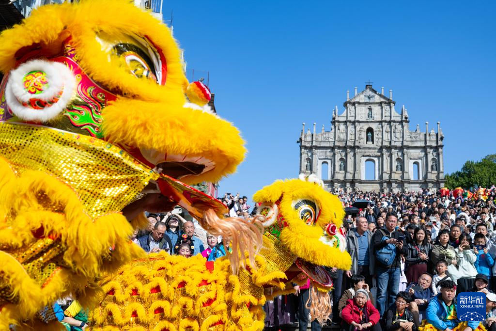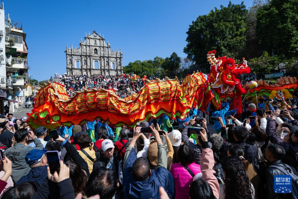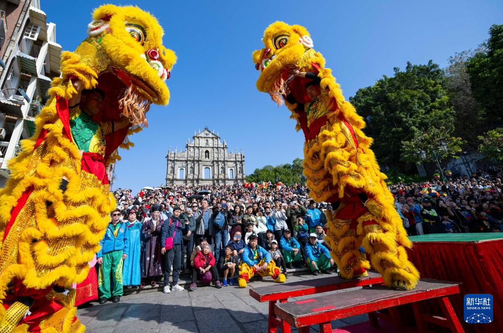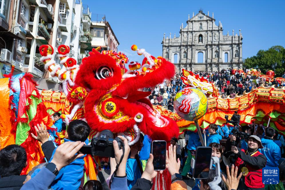 大年初二,澳门旅游局在大三巴牌坊前举办舞龙舞狮等贺岁活动,吸引大批市民及游客驻足观赏。