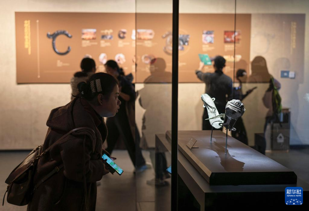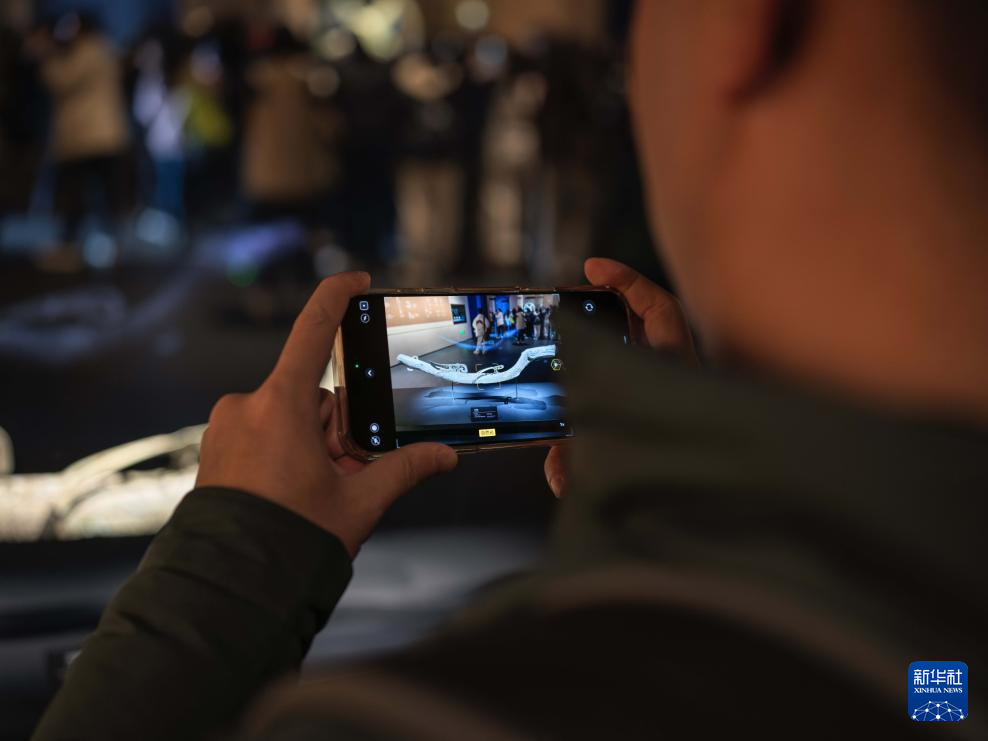 观众在三星堆博物馆拍摄展出的青铜蛇展品(1月23日摄)。