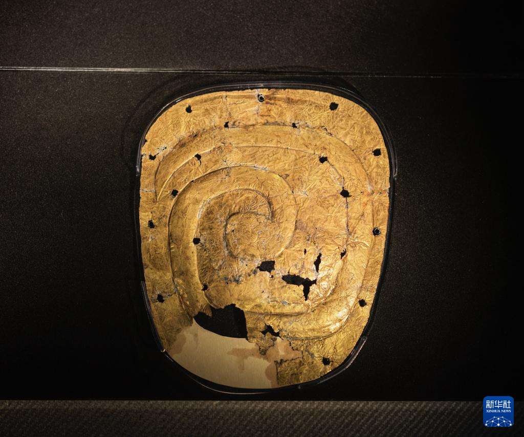 金沙遗址博物馆展出商周时期的蛇纹圆角梯形金箔(1月23日摄)。