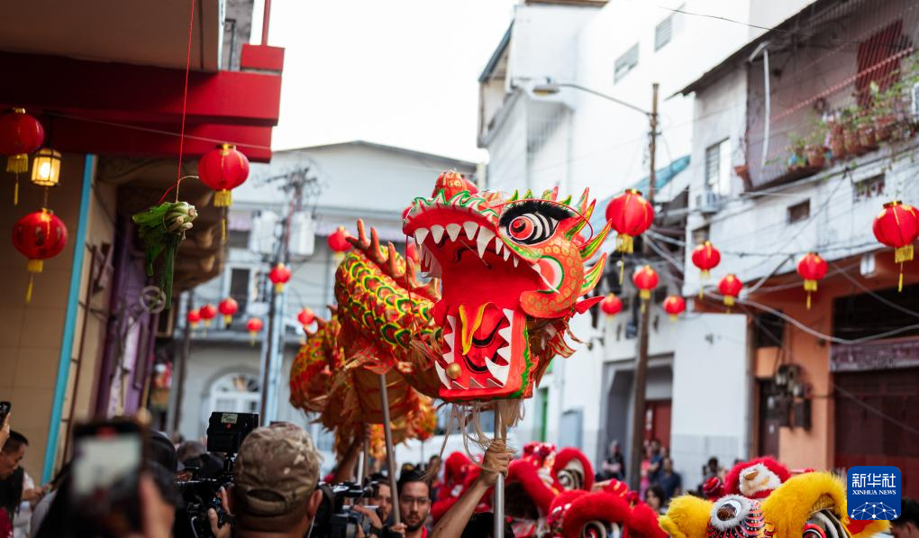 1月29日,在巴拿马首都巴拿马城老城的唐人街,人们进行舞龙舞狮表演。2021年11月,中国农历新年成为巴拿马全国性节日。