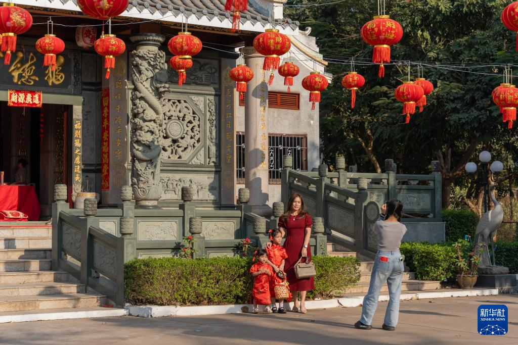 1月29日,在老挝首都万象,当地民众在福德庙祈福迎春。