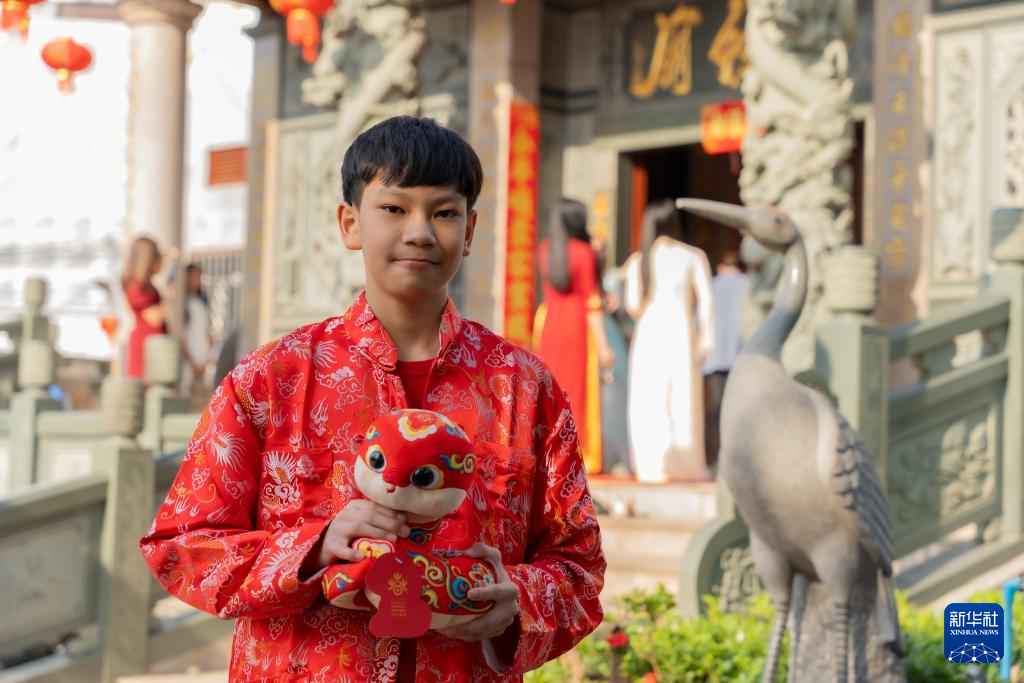 1月29日,在老挝首都万象,一名当地男孩拿着蛇年玩偶在福德庙祈福迎春。