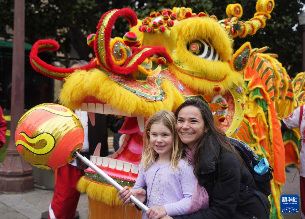 1月29日,在美国旧金山唐人街,一对母女与舞龙队伍合影。