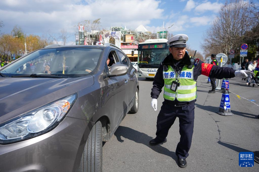 1月30日,执勤人员在云南昆明海埂大坝附近指引车辆通行。