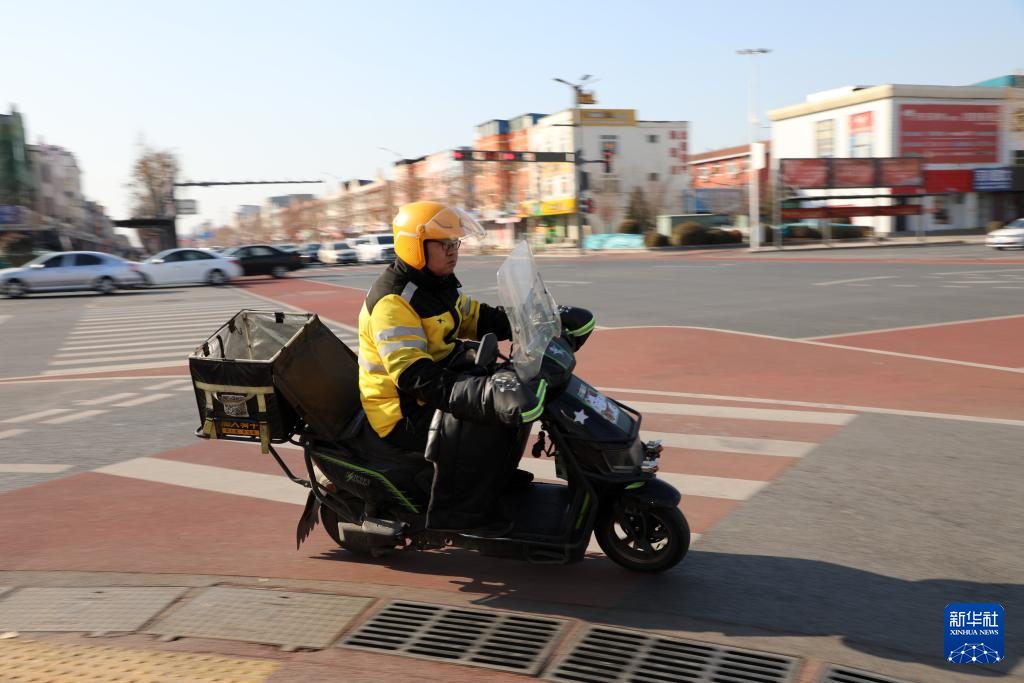 1月29日,在山东省滨州市博兴县街头,一名外卖小哥在骑行为顾客送餐。