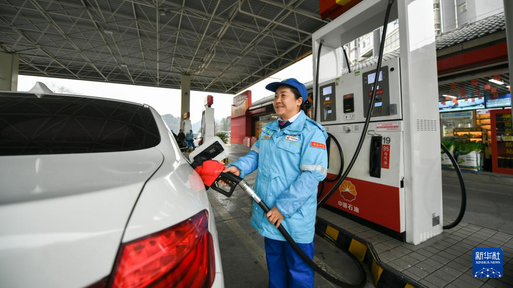 1月30日,在湖南省湘西土家族苗族自治州凤凰县一加油站,加油员为游客车辆加油。