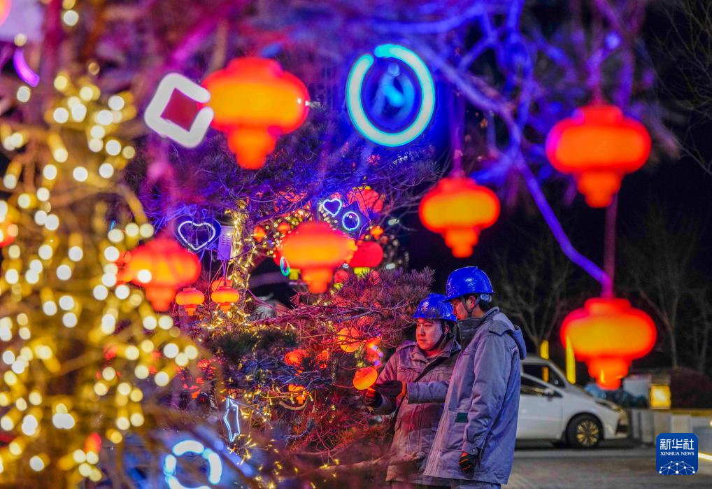 1月29日,工人在河北省遵化市检查城市街道景观灯线路。
