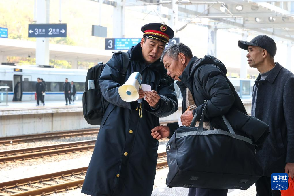 1月30日,国铁南昌局宁德站客运员张鹏昌在站台服务旅客。